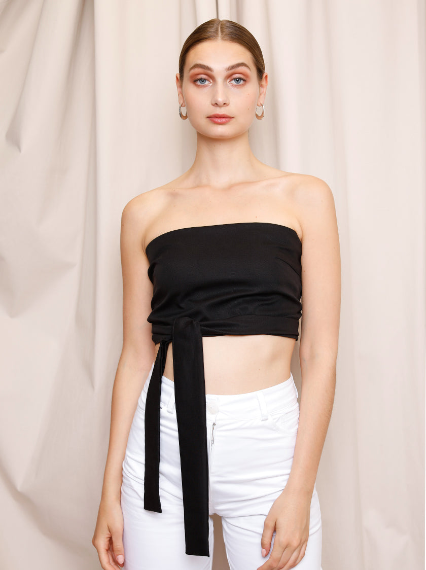 This strapless top features long adjustable straps that can be styled in multiple ways: tied at the front for a clean look, tied at the back for a soft bow detail, or crossed at the back and tied at the neckline for a more sculptural silhouette. This makes the piece highly versatile and suitable for both casual and elevated styling.